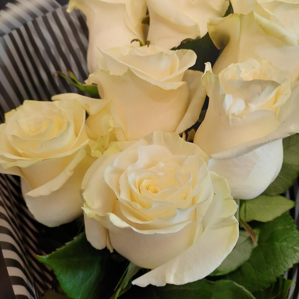 белые розы эквадор 60 см – 7 шт.Калька упаковка – 1 шт.Лента атласная – 2 шт.