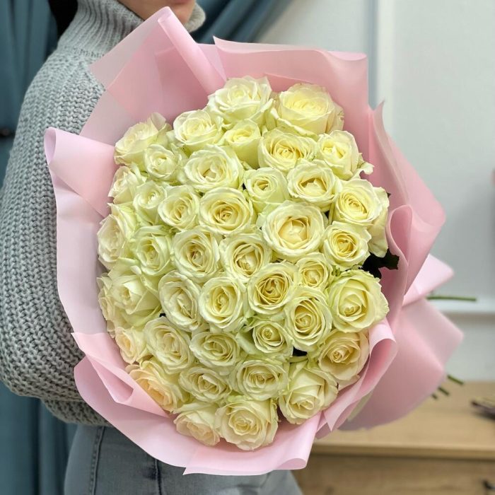 Лента атласная – 1 шт.Пленка матовая – 3 шт.Роза белая – 51 шт.