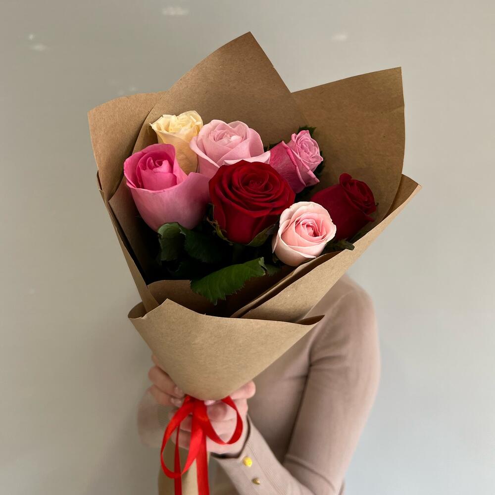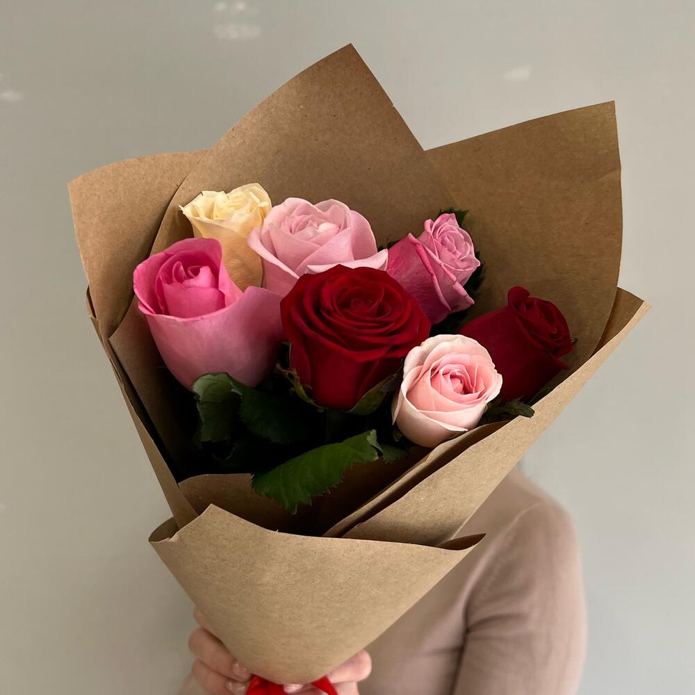 Роза – 7 шт.Лента атласная – 1 шт.Упаковка дизайнерская – 1 шт.