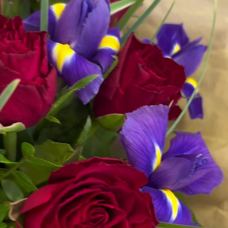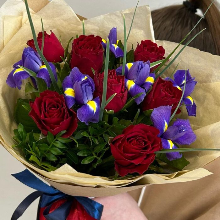 Роза – 7 шт.Ирис – 9 шт.Упаковка дизайнерская – 2 шт.Лента атласная – 2 шт.