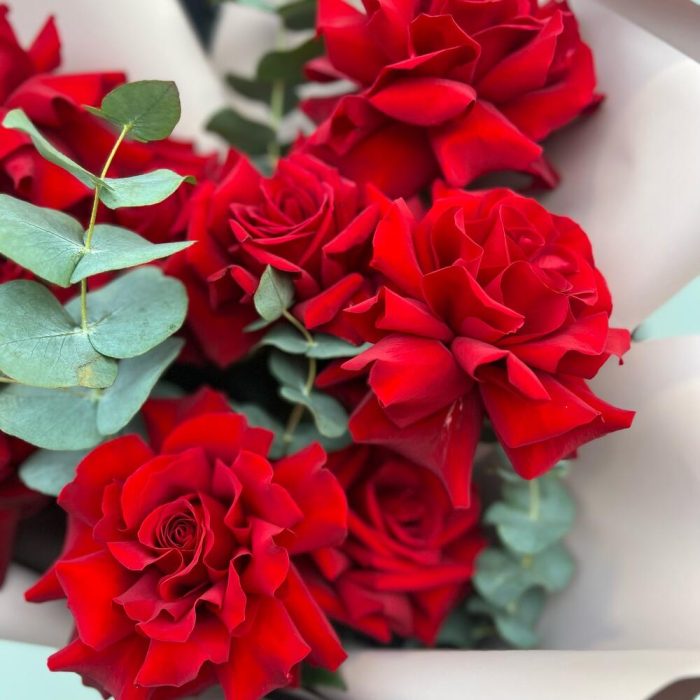 Эвкалипт – 1 шт.Лента органза – 1 шт.Пленка матовая – 2 шт.французская роза красная – 11 шт.