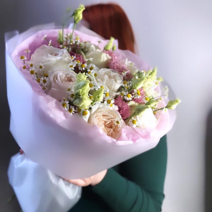 роза white o’hara – 9 шт.Эустома – 3 шт.Матрикария (Ромашка Камила) – 4 шт.Тишью – 2 шт.Упаковка дизайнерская – 2 шт.Лента атласная – 1 шт.