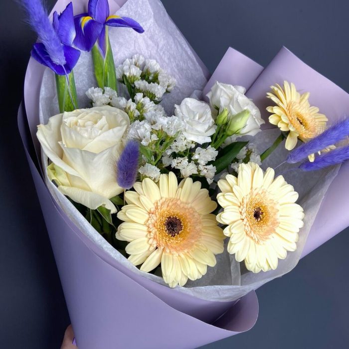Упаковка – 1 шт.Статица белая – 1 шт.Ирис Blue Magic – 2 шт.Роза белая мондиаль – 1 шт.Мини гербера – 3 шт.Лагурус (сухоцвет) – 4 шт.лизиантус розита вайт – 1 шт.