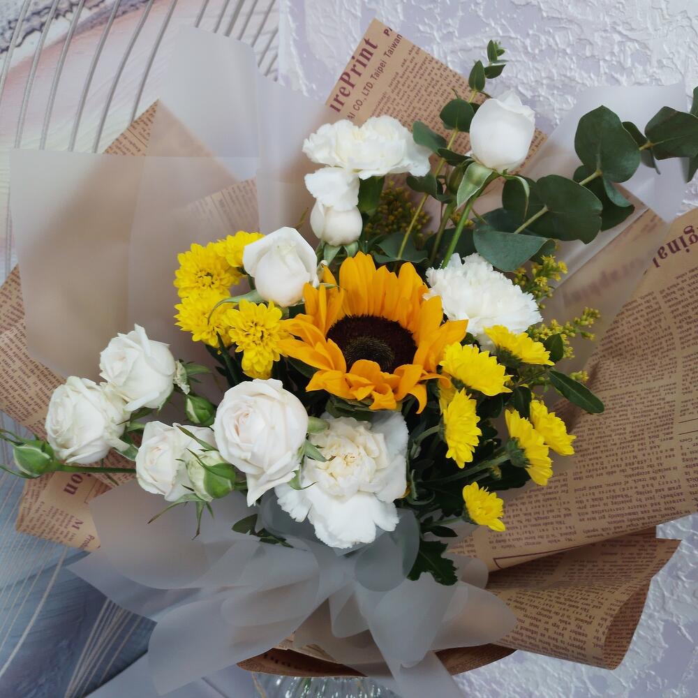 Категорий: Гвоздики, Кустовые розы, Подсолнухи, Розы, Хризантемы