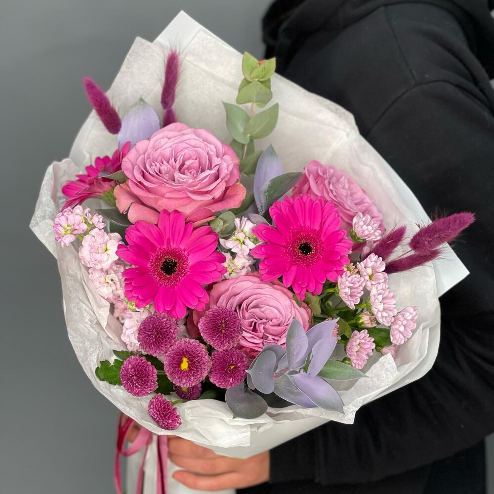 Маттиола – 3 шт.Рускус – 3 шт.Хризантема Сантини – 2 шт.Эвкалипт – 1 шт.Роза одноголовая – 3 шт.Лента атласная – 1 шт.Гербера мини – 3 шт.Упаковка дизайнерская – 1 шт.Лагурус – 7 шт.