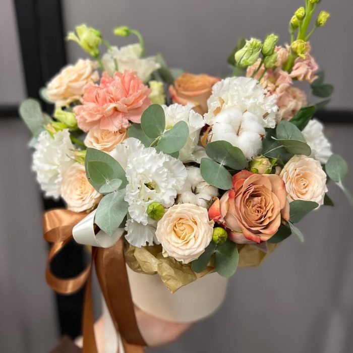 Роза Капучино – 2 шт.Хлопок – 2 шт.Эвкалипт – 2 шт.Лента атласная – 2 шт.Тишью – 1 шт.Диантус – 1 шт.Коробка шляпная – 1 шт.Оазис флористический – 1 шт.эустома махровая белая – 2 шт.Маттиола априкот – 1 шт.роза кустовая таня – 1 шт.