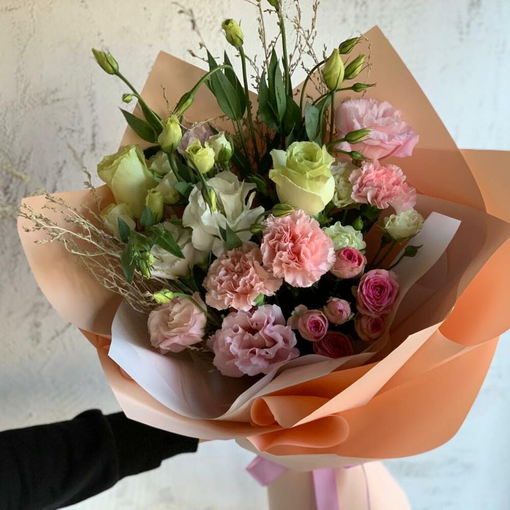 Альстромерии, Гвоздики, Кустовые розы, Лизиантусы, Розы, Хризантемы