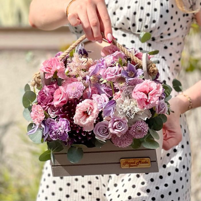 Роза – 3 шт.Лизиантус – 3 шт.Сантини – 2 шт.Астильба – 1 шт.Диантус – 7 шт.цветы микс – 5 шт.зелень декоративная – 5 шт.Эвкалипт – 1 шт.Клематис – 1 шт.Ящик деревянный – 1 шт.Флористическая губка – 1 шт.