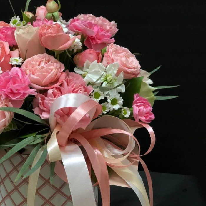 Роза – 5 шт.Роза Кенийская – 1 шт.Роза кустовая – 2 шт.Диантус – 3 шт.Диантус кустовой – 3 шт.хризантемы – 2 шт.Эвкалипт – 2 шт.Рускус – 5 шт.Оазис флористический – 1 шт.Лента атласная – 3 шт.Коробка шляпная – 1 шт.