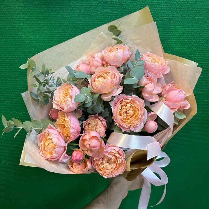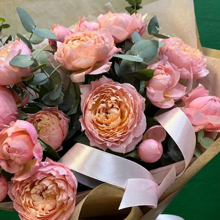 эвкалипт цинарея – 7 шт.Лента атласная нежно-розовая – 4 шт.Роза кустовая пионовидная джульетта – 5 шт.упаковка натуральный крафт – 1 шт.тишью нежно-розовое – 1 шт.