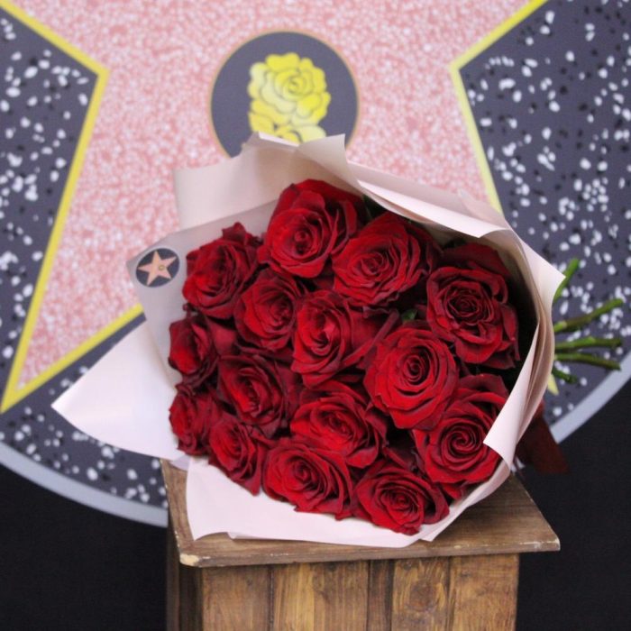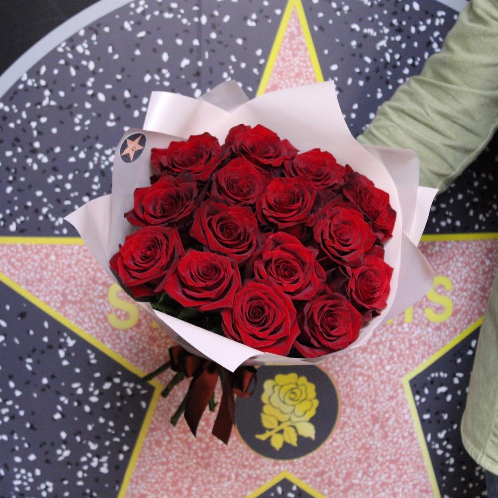 Роза Эксплорер – 15 шт.Пленка дизайнерская – 3 шт.Лента атласная – 2 шт.