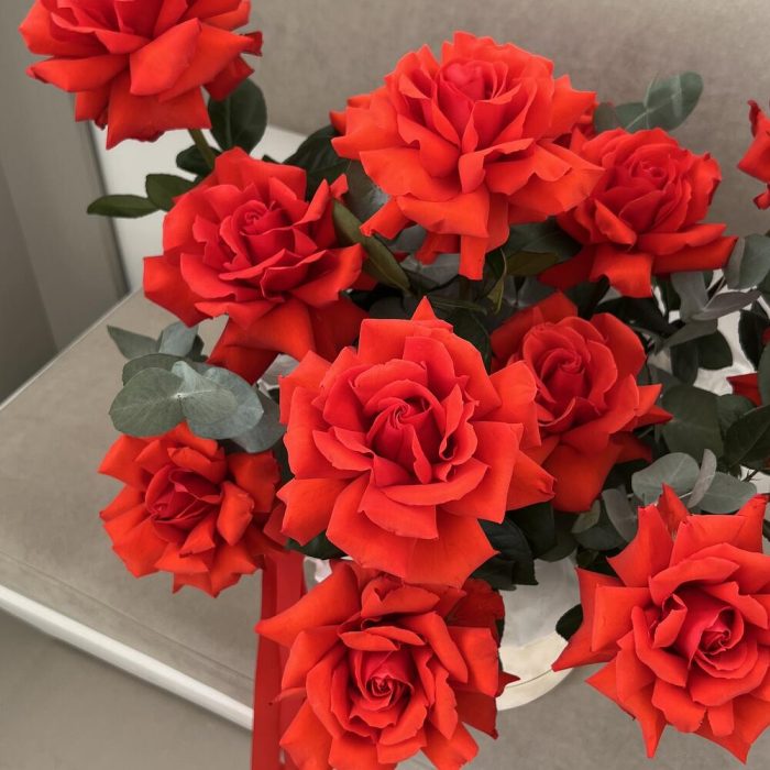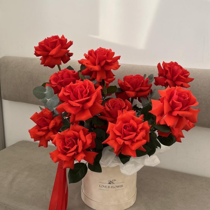 коробка бархатная цилиндр – 1 шт.эвкалипт cineria пучок – 1 шт.оазис губка флористическая – 3 шт.тишью хрустящая – 1 шт.роза французская by nina – 15 шт.