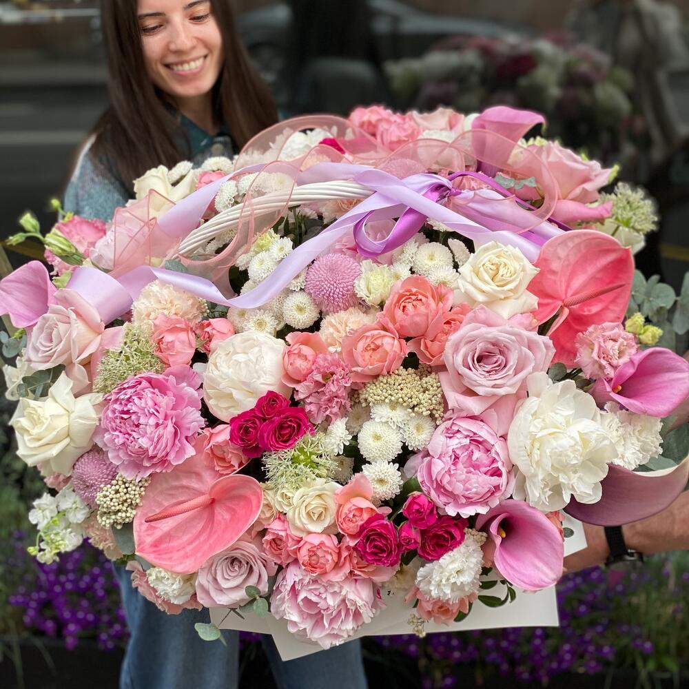 Корзина плетеная – 1 шт.Оазис флористический – 10 шт.Пион – 5 шт.Кустовая роза – 10 шт.Роза – 10 шт.Диантус – 10 шт.Хризантема кустовая – 10 шт.Калла – 5 шт.Озотамнус – 5 шт.Зелень – 5 шт.Сухоцветы – 5 шт.