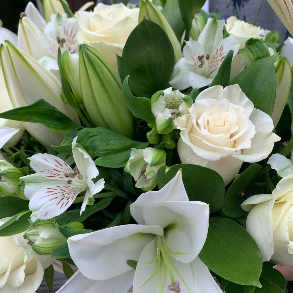 Корзина с лилией, белыми розами, альстромерией и декоративной зеленью «Весенний сад»