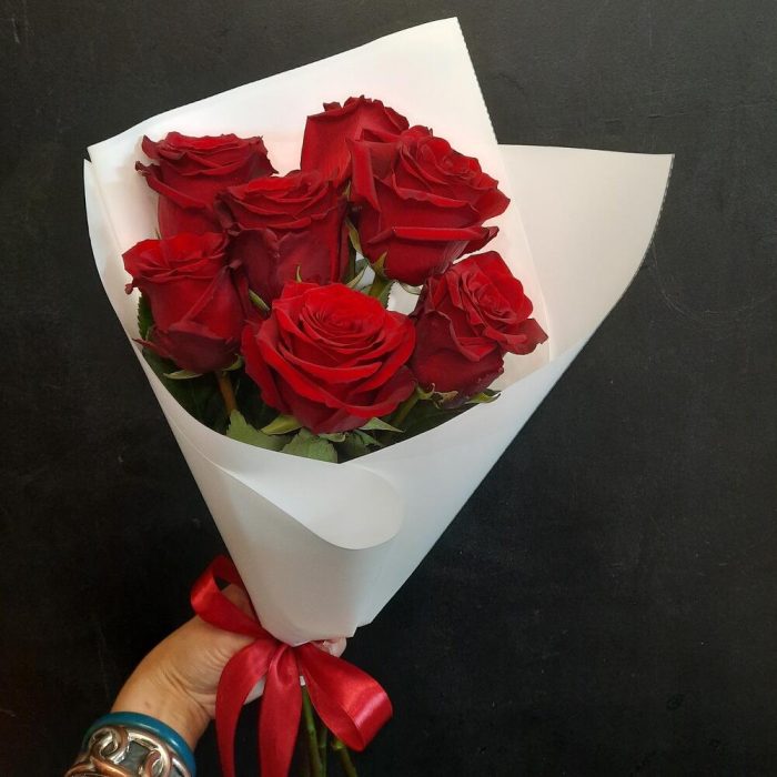 Роза Эквадор 60 см – 7 шт.Калька упаковка – 1 шт.Лента атласная – 2 шт.