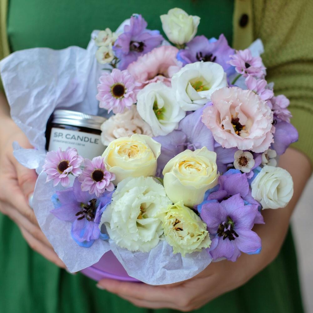 Дельфиниум – 1 шт.Роза пионовидная – 2 шт.Лизиантус – 3 шт.Хризантема кустовая – 2 шт.Аромасвеча – 1 шт.Шляпная коробка – 1 шт.Тишью – 1 шт.