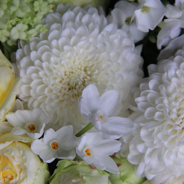 Роза пионовидная кустовая – 2 шт.Вибурнум – 2 шт.Ахиллея – 2 шт.Флокс – 2 шт.Эвкалипт – 5 шт.Тишью – 2 шт.Бумага – 2 шт.Лента атласная – 2 шт.