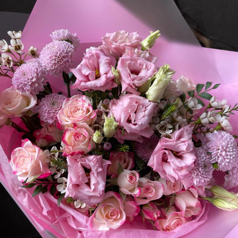 Малиновый зефир: розы, эустома и хризантема