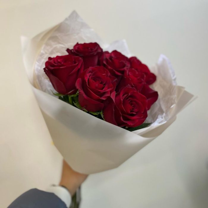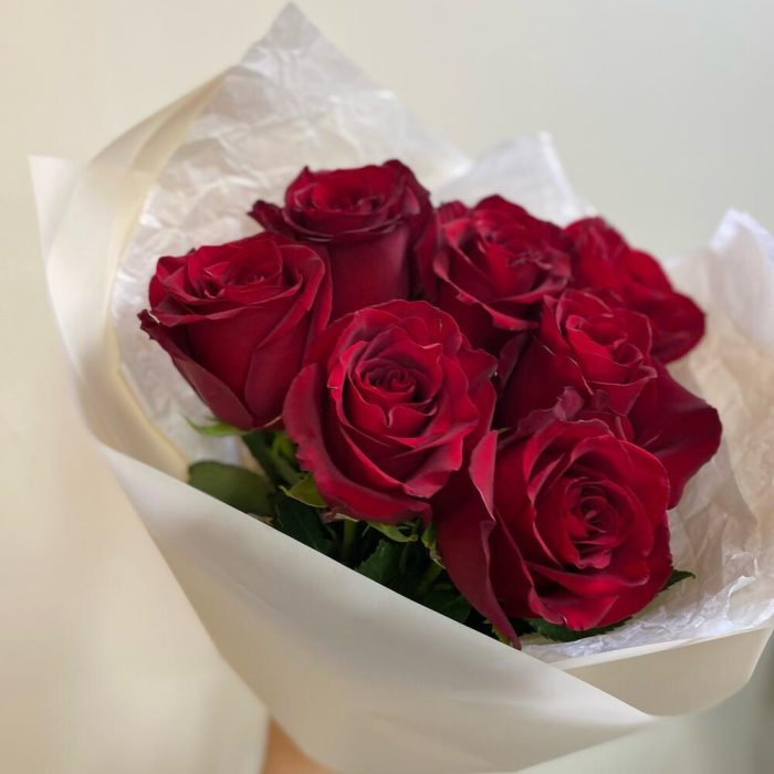 Упаковка с атласной лентой – 5 шт.Тишью белое – 2 шт.роза эквадор эксплорер премиум – 7 шт.
