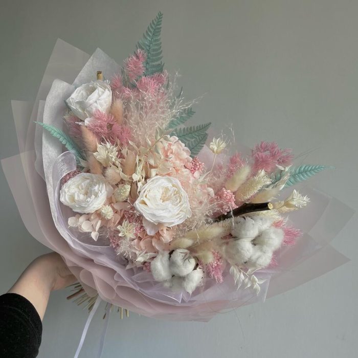 Гортензия – 1 шт.Озотамнус – 2 шт.Папоротник – 1 шт.Рускус – 2 шт.Хлопок – 2 шт.Аспарагус – 1 шт.Упаковка дизайнерская – 1 шт.Роза стабилизированная – 3 шт.Ковыль – 3 шт.Нигелла – 1 шт.Лагурус – 12 шт.Мак – 2 шт.Фаларис – 8 шт.пампасная трава – 1 шт.