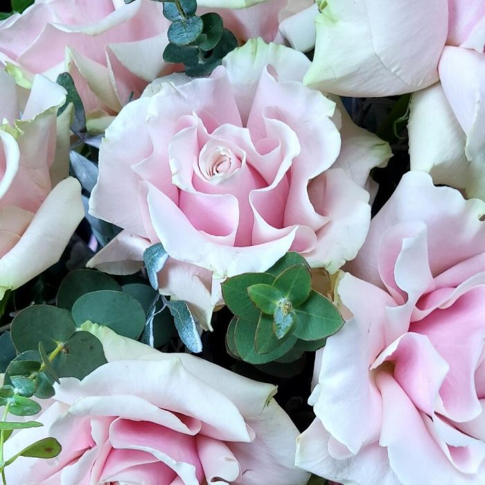 Эвкалипт – 3 шт.Роза Эквадор – 7 шт.Фисташка – 4 шт.Шляпная коробка – 1 шт.