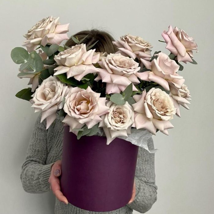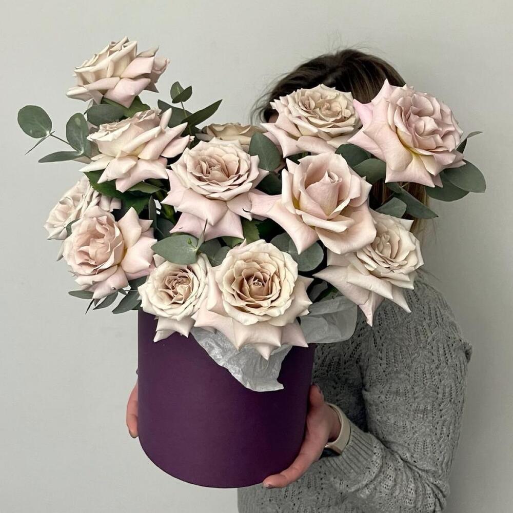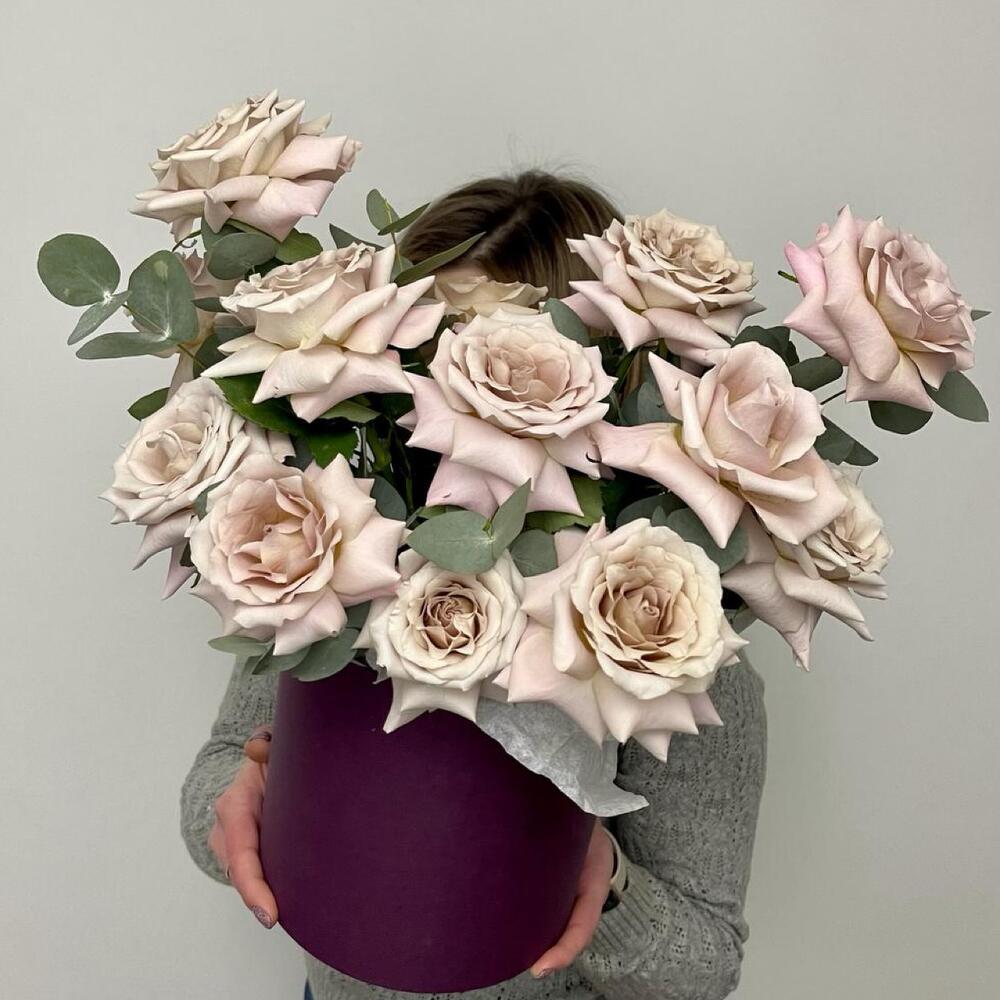 Эвкалипт – 2 шт.Роза – 15 шт.Коробка шляпная – 1 шт.Оазис флористический – 2 шт.