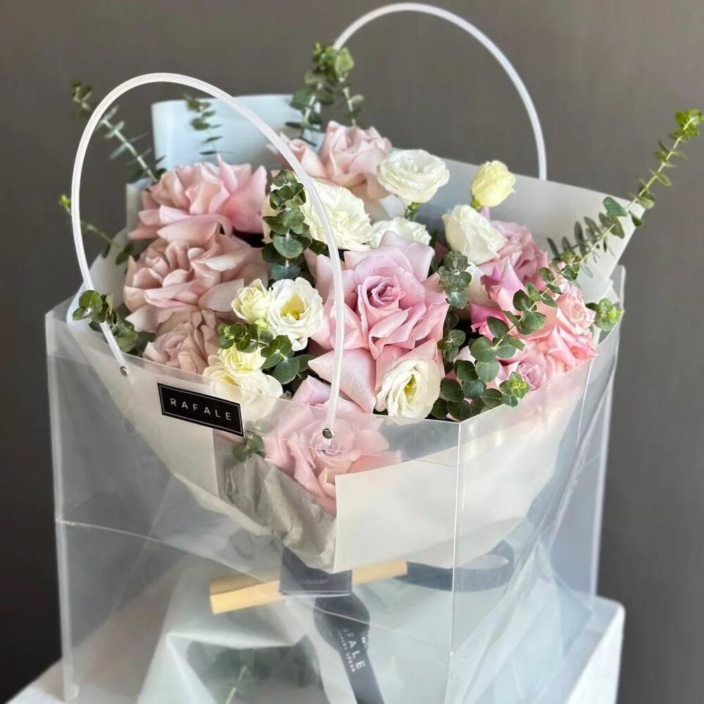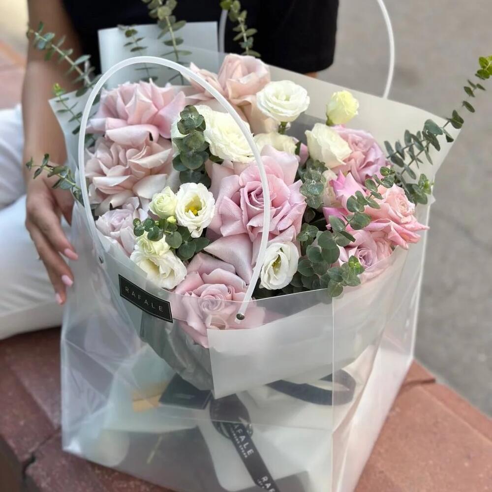 Букет "PACKAGE 8.0" состоит из 9 голландских роз, 3 лизиантусов и 2 веток эвкалипта в оформлении с оригинальной подачей в эксклюзивном пакете. Выбрав букет от RAFALE, Вы скрасите день обладательницы букета и подарите ей незабываемые эмоции.