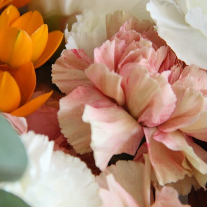 Авторский букет с маттиолой, гвоздиками и орнитогалумом, пионовидными розами, эвкалиптом и ранункулюсами.Стильное цветочное решение для любого случая.