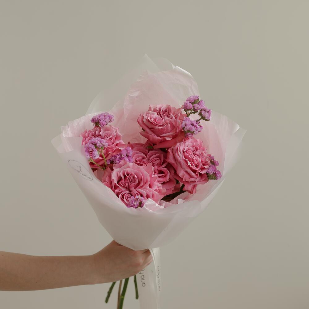Статица – 2 шт.Роза Эквадор – 5 шт.Упаковка дизайнерская – 1 шт.инструкция по уходу за цветами – 1 шт.любовь флориста – 100 шт.открытка с вашим текстом – 1 шт.подкормка для цветов – 1 шт.медиант ручной работы из бельгийского шоколада – 1 шт.