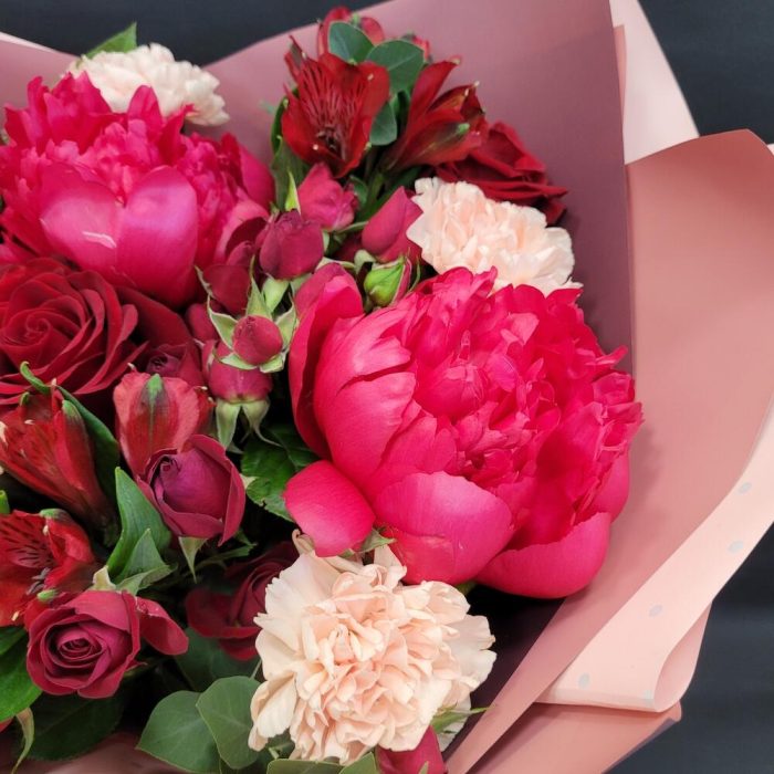 Альстромерии, Гвоздики, Кустовые розы, Лизиантусы, Розы, Хризантемы