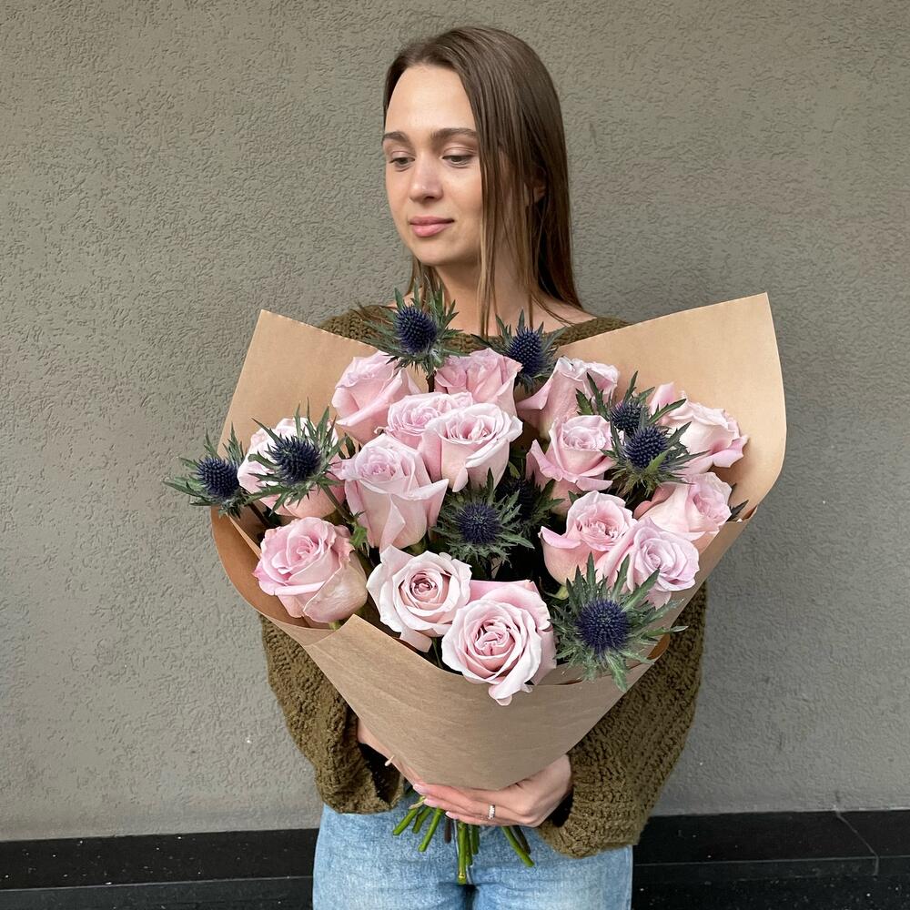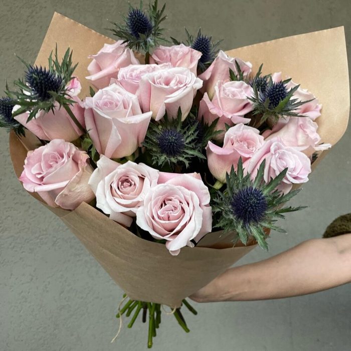 Крафт – 3 шт.Эрингиум синий – 3 шт.Роза розовая 50 см – 15 шт.