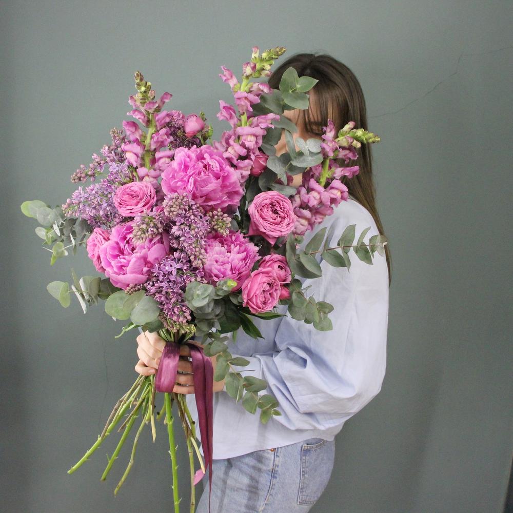 Букет с сиренью, пионами, львиным зевом, пионовидными розами и эвкалиптом.Отличный выбор для подарка на день всех влюблённых, 14 февраля.