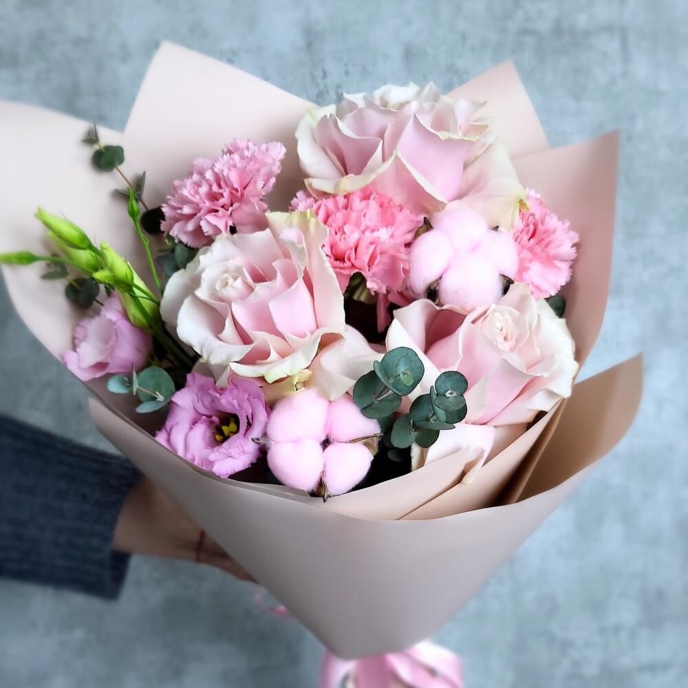 Лизиантус – 1 шт.Хлопок – 2 шт.Эвкалипт – 1 шт.Роза – 3 шт.Гвоздика – 3 шт.