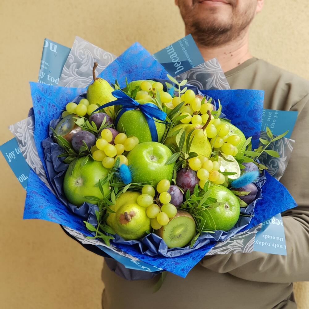 Элегантный фруктовый букет – прекрасный подарок не только для девушек , мужчины веганы , спортсмены оценят по достоинству эту модель.Возможно изменение цвета упаковки на нежные оттенки ( пожелания пишите в комментариях при оформлении заказа )