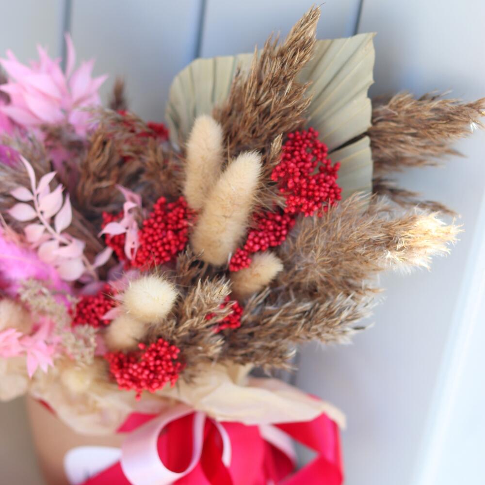 камыш декоративный – 7 шт.Лист пальмы – 1 шт.рускус стабилизированный – 1 шт.Озотамнус – 1 шт.Лагурус – 15 шт.Сетария – 1 шт.Колосья – 5 шт.Стифа – 1 шт.