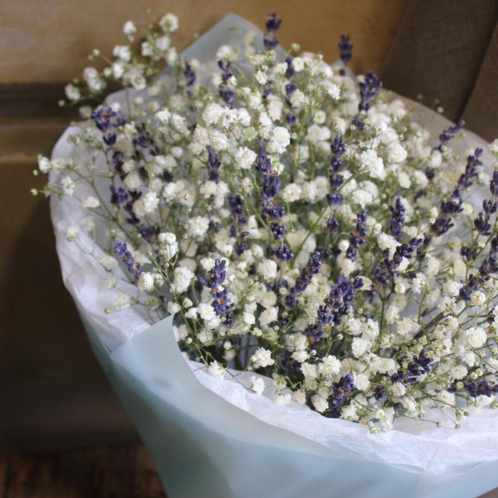 Гипсофила – 3 шт.Упаковка дизайнерская – 1 шт.Лаванда сухая – 4 шт.