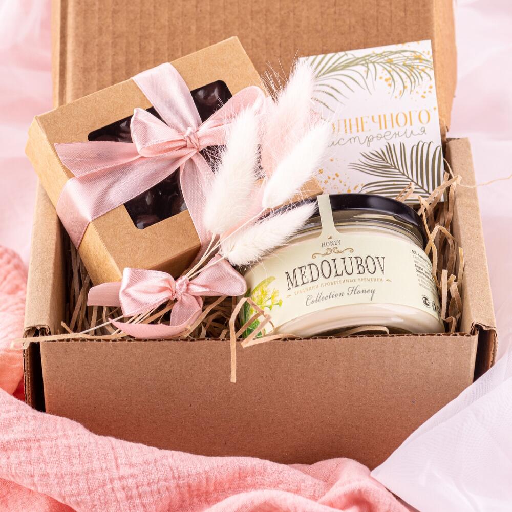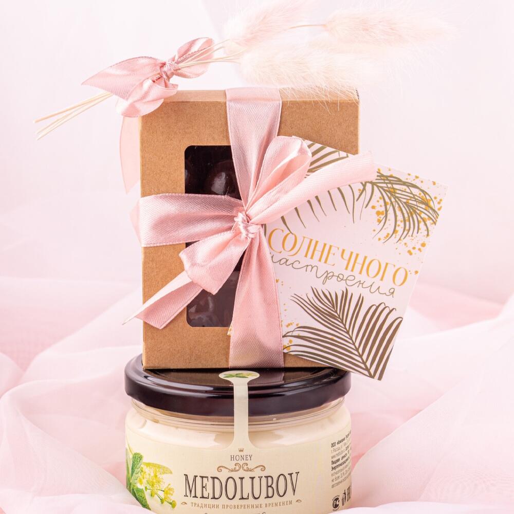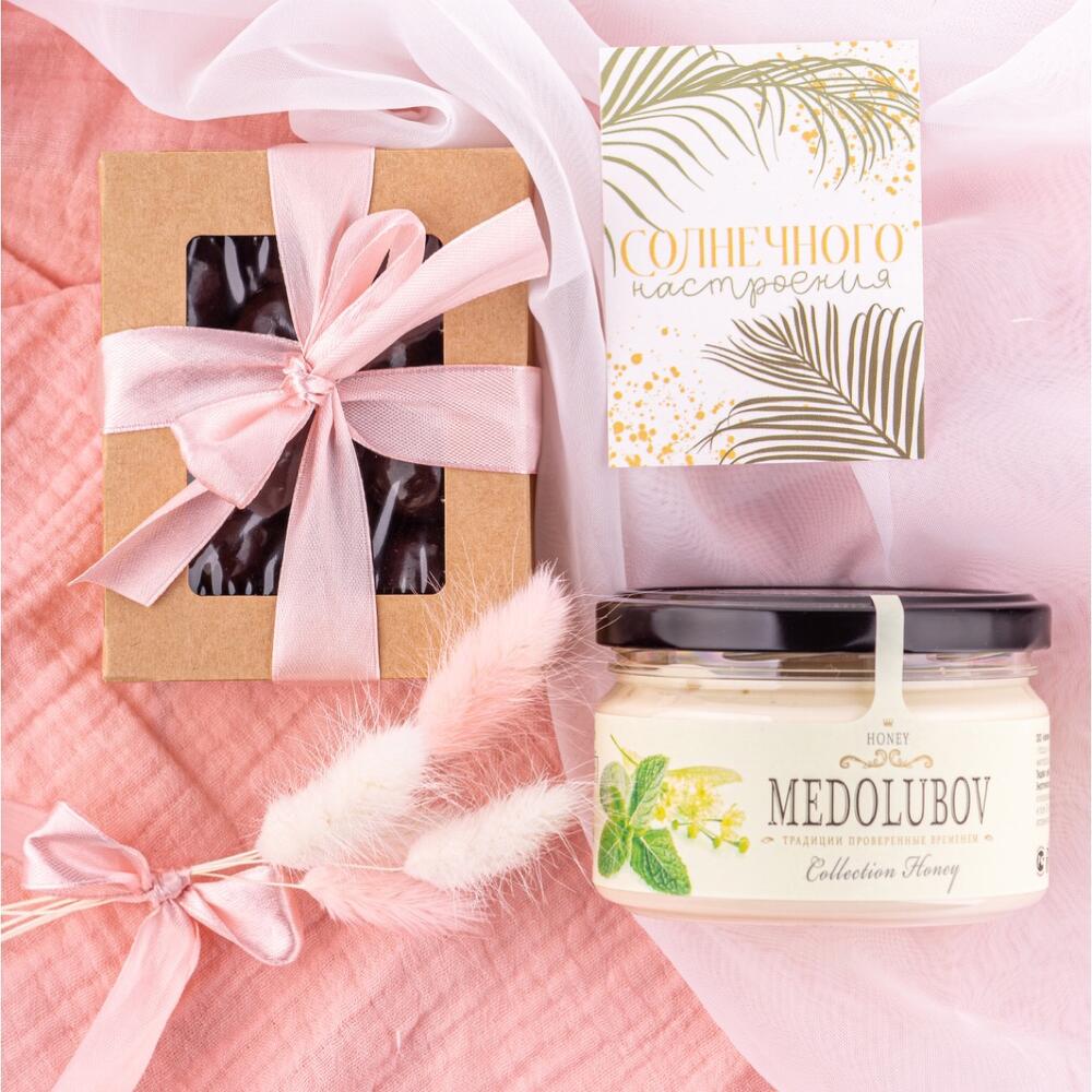 Фундук в шоколаде – 150 гр.Мини открытка – 1 шт.букетик из сухоцветов – 1 шт.мед-суфле липовый с мятой – 250 мл