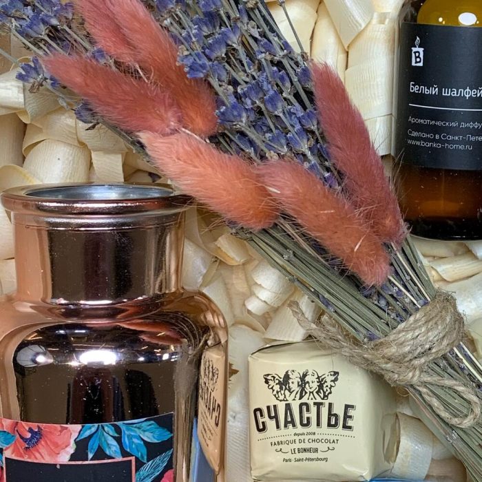 Ящик деревянный – 1 шт.Ваза стекло – 1 шт.букет сухоцветов из лагуруса и лаванды – 1 шт.свеча banca home в ассортименте – 1 шт.диффузор banka home в ассортименте – 1 шт.конфеты счастье 50г – 2 шт.
