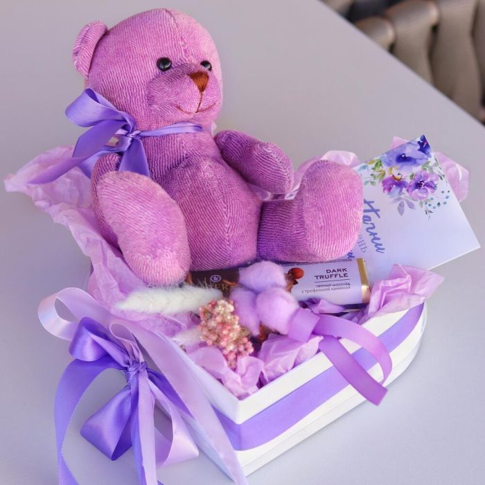 Озотамнус – 1 шт.Хлопок – 1 шт.Коробка сердце – 1 шт.Лагурус – 2 шт.Мишка плюшевый – 1 шт.Открыточка с вашими пожеланиями – 1 шт.Шоколадка – 1 шт.