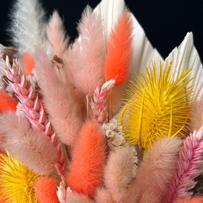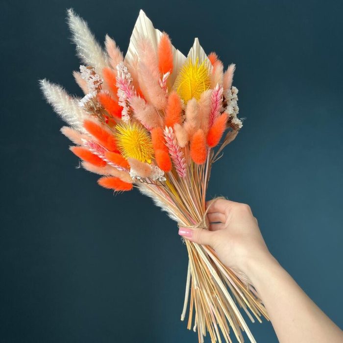 Лагурус (сухоцвет) – 80 шт.ворсянка сухоцвет – 4 шт.статица стабилизированная – 5 шт.пальма сухоцвет – 2 шт.Колосья пшеницы – 10 шт.пампас мини – 3 шт.
