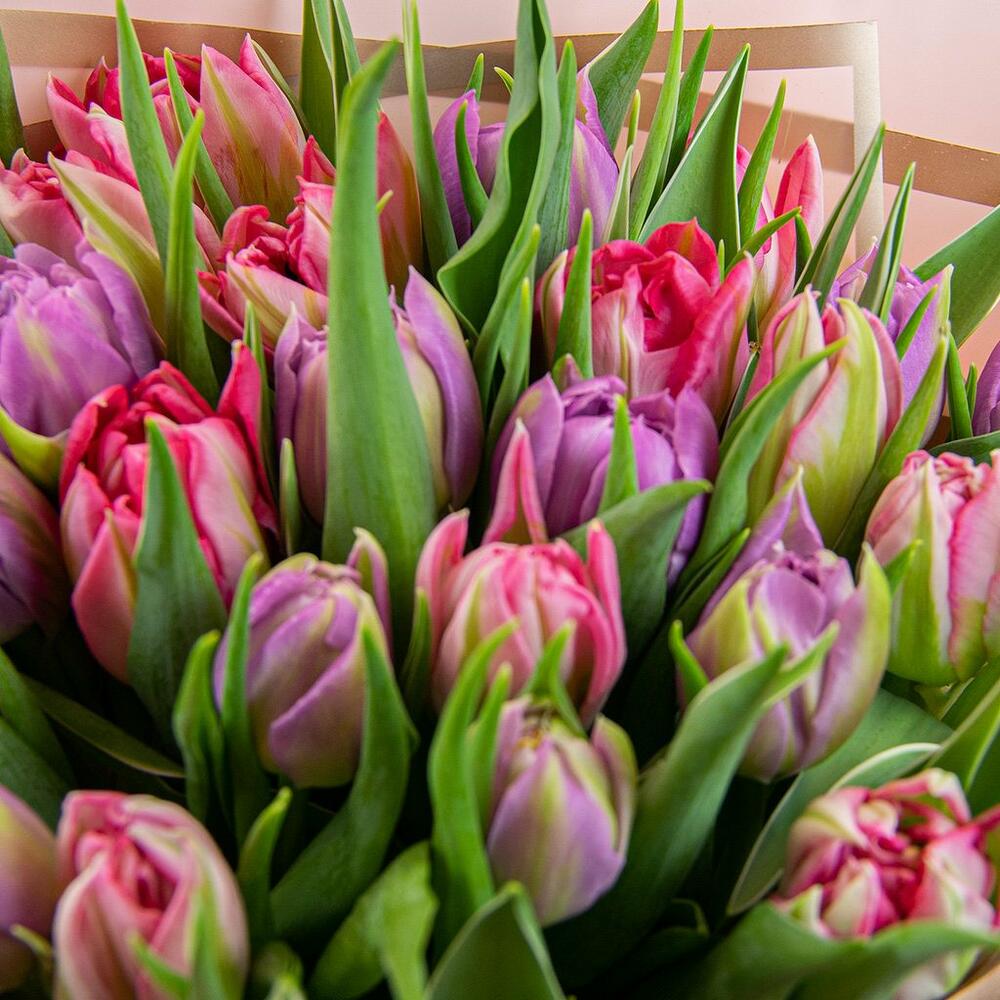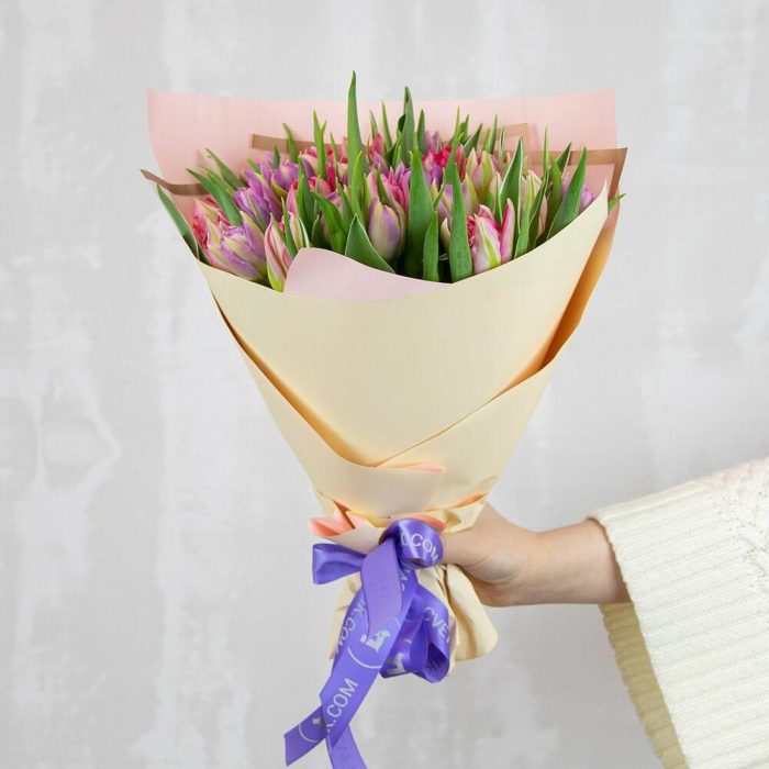 Букет из 25 тюльпанов пионовидных микс в дизайнерской упаковке