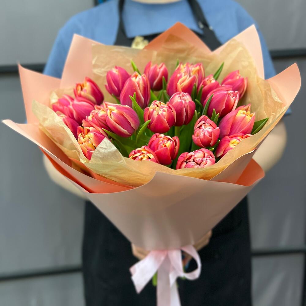 Тюльпан пионовидный – 25 шт.Тишью – 2 шт.Пленка матовая – 3 шт.Лента атласная – 2 шт.